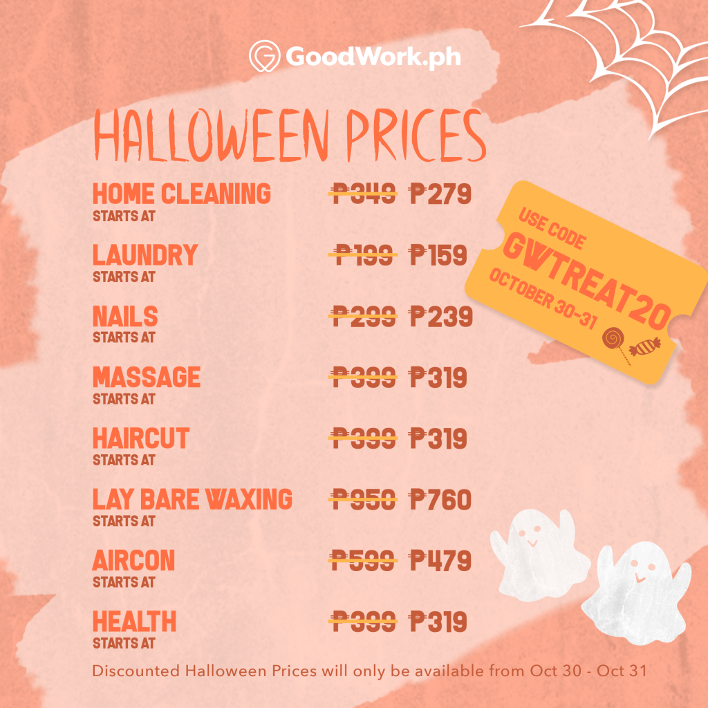 For every nails, hair, and massage booking completed from October 25 to October 31, you get a chance to win a GoodWork Mystery Box filled with our favorite Halloween goodies and ADDITIONAL discount vouchers that you can use during our Halloween Sale on Oct. 30-31!
