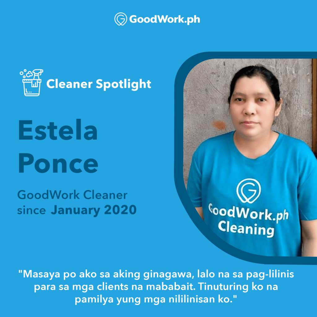 Ate Estela, also known as “Nene” by the people who know her best, is no stranger to the industry of cleaning. Before GoodWork, she worked as a caregiver for a total of 16 years. This already speaks volumes about ate Nene’s character; that she is willing to dedicate her life to caring for others and that she has the strength to power through such a demanding job.