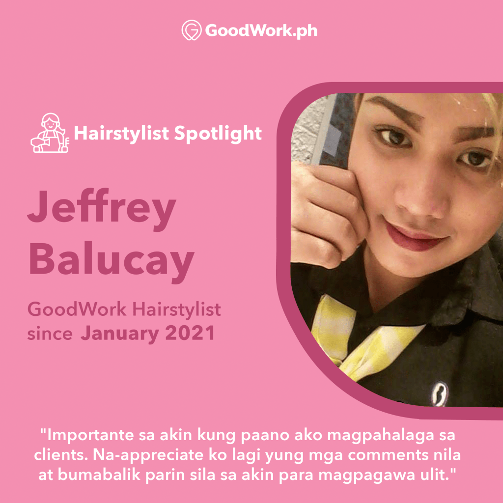 Meet Jeffrey “Jashly” Balucay, a GoodWork Hairstylist who has been with the team since January 2021. At the young age of 28, Jashly already has 8 years of experience under his belt. Today, we shine the spotlight on him and his many skills as a hairstylist so he can share the things he has learned along the way.