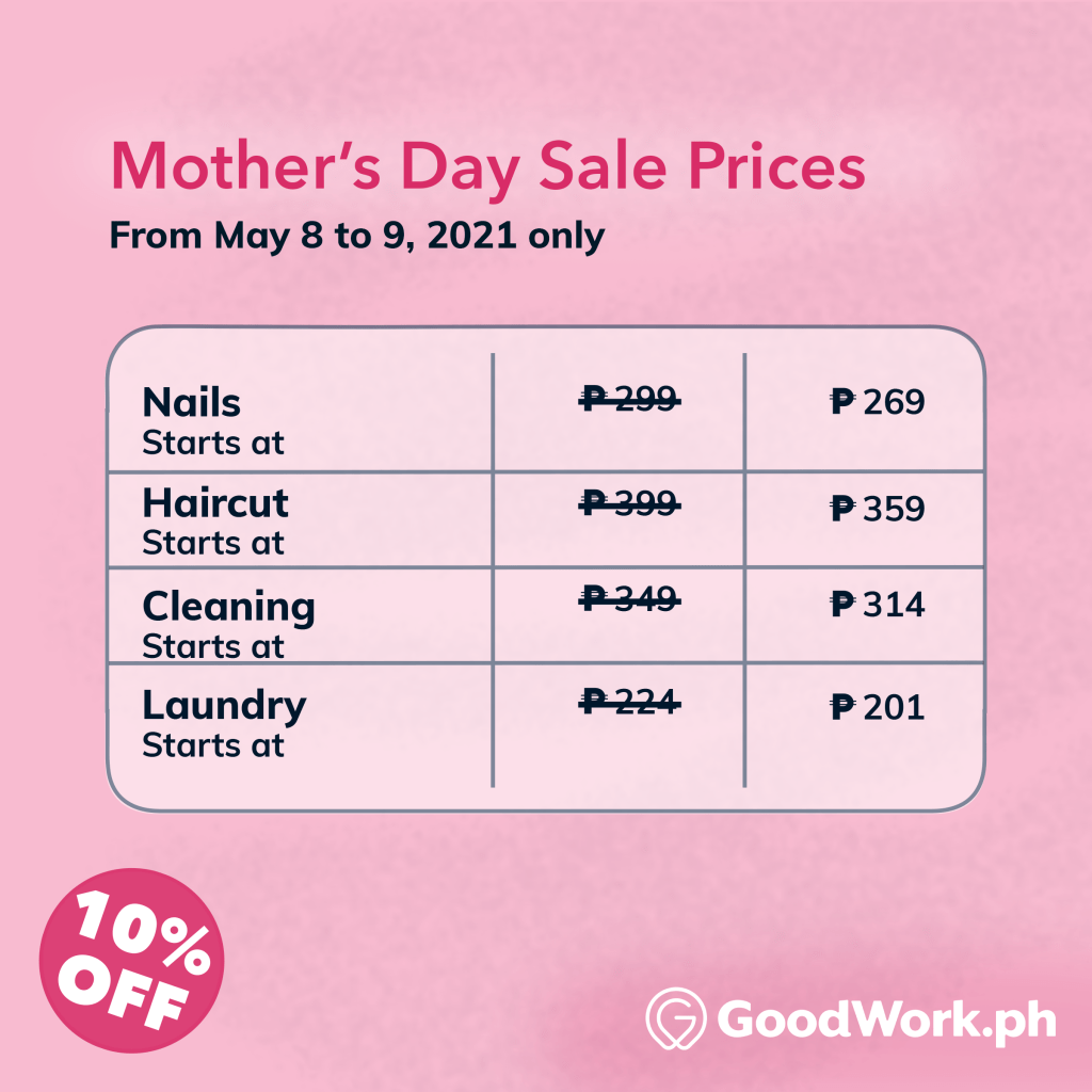 Get 10% off all Hair, Nails, Laundry, and Cleaning services on the GoodWork app when you book this Mother’s Day weekend!