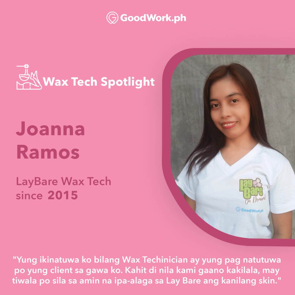 Joanna Joy Ramos has been a Lay Bare Wax Technician since 2015. With over 6 years of honing her skills and service, Ate Joanna has mastered the art of waxing as efficiently and painlessly as possible. Today we shine the spotlight on Ate Joanna and her experiences as a home-servicing Lay Bare Wax Technician.