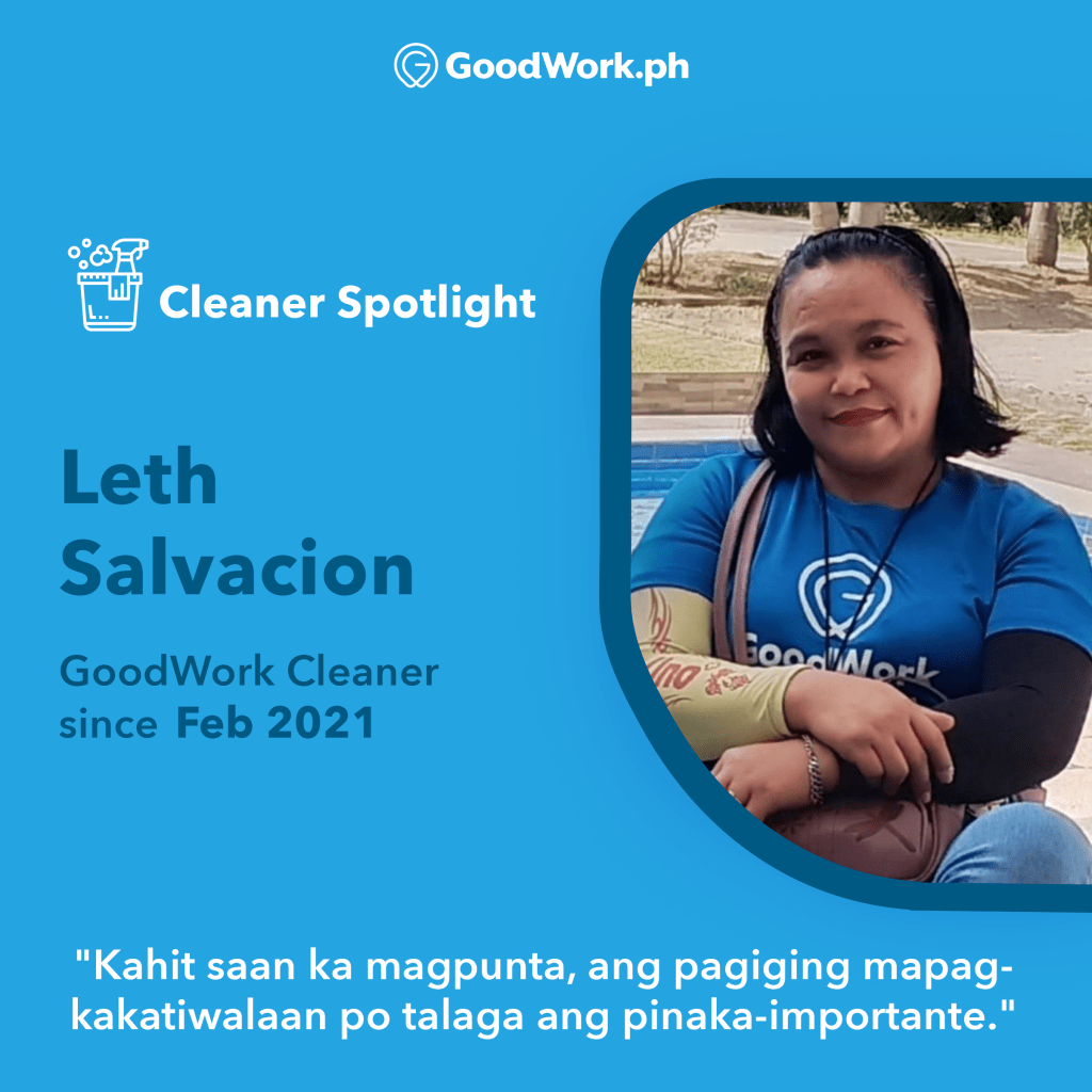 Leth Salvacion has been part of the GoodWork Cleaning team since February 2021. In her time with us so far, she has helped bring sparkle to the homes of many GoodWork users, getting a consistent average rating of 5 stars. Today we shine the spotlight on Ate Leth and her invaluable contributions to the team.