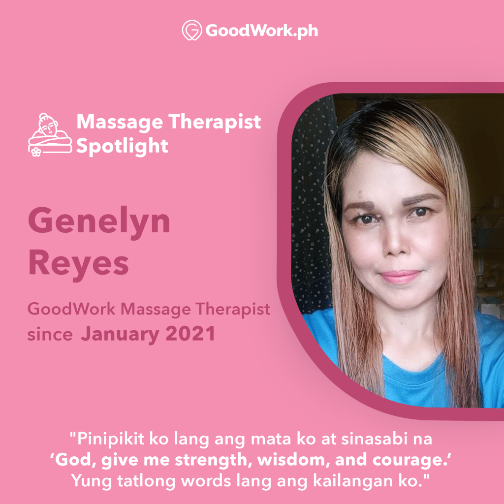 Meet Genelyn Reyes, known warmly by many as “Ate Gen.” She has been a member of the GoodWork Massage Team since the beginning of 2021, already servicing over dozens of clients with a consistent average rating of 4.7 stars. Today we shine the spotlight on Ate Gen and her invaluable contributions to GoodWork.