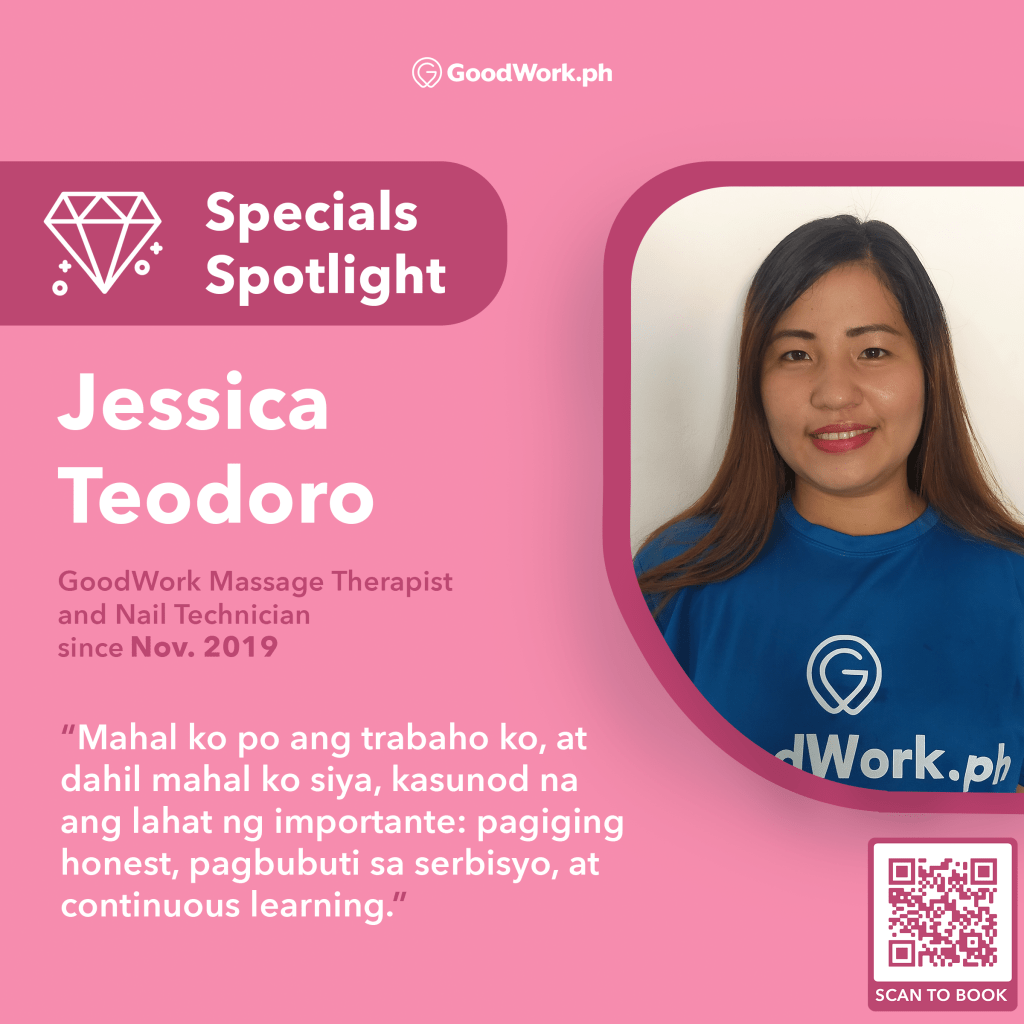 Jess started her professional journey as a beauty service technician in Zennya, where she grew her skills in both massage techniques and nail service: “Mga 3 years mahigit na po akong therapist,” she adds. She decided to transfer to GoodWork and become a service partner of the company in 2019, and since then has been able to offer packaged services for both nails and massage clients.